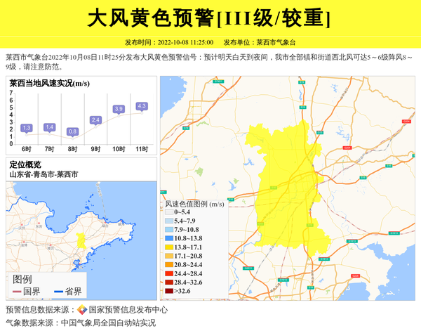 莱西市气象台2022年10月08日11时25分发布大风黄色预警信号:预计明天白天到夜间,我市全部镇和街道西北风可达5~6级阵风8~9级,请注意防范。 信息来源:国家预警信息发布中心; 发布单位:莱西市气象台。