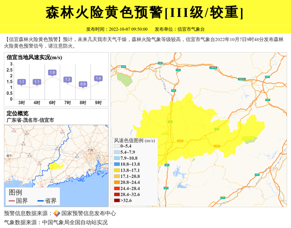 【信宜森林火险黄色预警】预计,未来几天我市天气干燥,森林火险气象等级较高,信宜市气象台2022年10月7日9时48分发布森林火险黄色预警信号,请注意防火。 信息来源:国家预警信息发布中心; 发布单位:信宜市气象台。