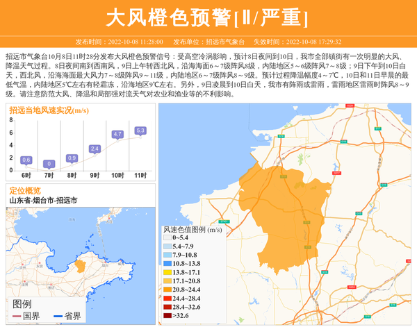 招远市气象台10月8日11时28分发布大风橙色预警信号:受高空冷涡影响,预计8日夜间到10日,我市全部镇街有一次明显的大风、降温天气过程。8日夜间南到西南风,9日上午转西北风,沿海海面6~7级阵风8级,内陆地区5~6级阵风7~8级;9日下午到10日白天,西北风,沿海海面最大风力7~8级阵风9~11级,内陆地区6~7级阵风8~9级。预计过程降温幅度4~7℃,10日和11日早晨的最低气温,内陆地区5℃左右有轻霜冻,沿海地区9℃左右。另外,9日凌晨到10日白天,我市有阵雨或雷雨,雷雨地区雷雨时阵风8~9级。请注意防范大风、降温和局部强对流天气对农业和渔业等的不利影响。 信息来源:国家预警信息发布中心; 发布单位:招远市气象台。