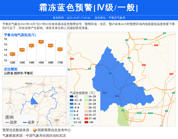 平鲁区气象台2022年10月7日17时45分发布霜冻蓝色预警信号,预警区域:全区。预计未来48小时预警区域内地面最低温度将要下降到0℃以下,对农业将产生影响。请有关单位和人员做好防范准备。 信息来源:国家预警信息发布中心; 发布单位:平鲁区气象局。