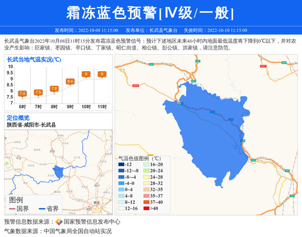 长武县气象台2022年10月08日11时15分发布霜冻蓝色预警信号:预计下述地区未来48小时内地面最低温度将下降到0℃以下,并对农业产生影响:巨家镇、枣园镇、亭口镇、丁家镇、昭仁街道、相公镇、彭公镇、洪家镇,请注意防范。 信息来源:国家预警信息发布中心; 发布单位:长武县气象台。