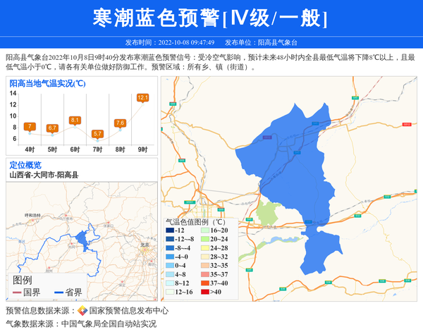 阳高县气象台2022年10月8日9时40分发布寒潮蓝色预警信号:受冷空气影响,预计未来48小时内全县最低气温将下降8℃以上,且最低气温小于0℃,请各有关单位做好防御工作。预警区域:所有乡、镇(街道)。 信息来源:国家预警信息发布中心; 发布单位:阳高县气象台。