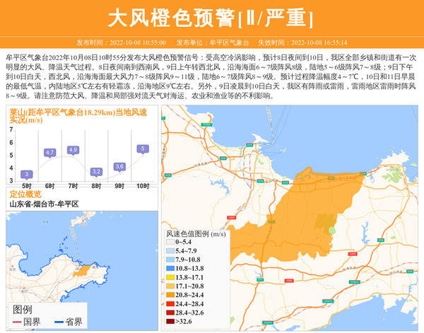 牟平区气象台2022年10月08日10时55分发布大风橙色预警信号:受高空冷涡影响,预计8日夜间到10日,我区全部乡镇和街道有一次明显的大风、降温天气过程。8日夜间南到西南风,9日上午转西北风,沿海海面6~7级阵风8级,陆地5~6级阵风7~8级;9日下午到10日白天,西北风,沿海海面最大风力7~8级阵风9~11级,陆地6~7级阵风8~9级。预计过程降温幅度4~7℃,10日和11日早晨的最低气温,内陆地区5℃左右有轻霜冻,沿海地区9℃左右。另外,9日凌晨到10日白天,我区有阵雨或雷雨,雷雨地区雷雨时阵风8~9级。请注意防范大风、降温和局部强对流天气对海运、农业和渔业等的不利影响。 信息来源:国家预警信息发布中心; 发布单位:牟平区气象台。