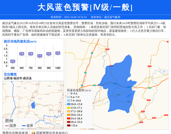 曲沃县气象台2022年10月8日10时25分发布大风蓝色预警信号,预警区域:所有乡镇。预计未来24小时预警区域有平均风力5~6级、阵风7级以上西北风。请有关单位和人员做好防范准备。 防御指南: 1.政府及相关部门按照职责做好防大风工作; 2.关好门窗,加固围板、棚架、广告牌等易被风吹动的搭建物,妥善安置易受大风影响的室外物品,遮盖建筑物资; 3.行人注意尽量少骑自行车,刮风时不要在广告牌、临时搭建物等下面逗留; 4.有关部门和单位注意森林、草原等防火。 信息来源:国家预警信息发布中心; 发布单位:曲沃县气象局。