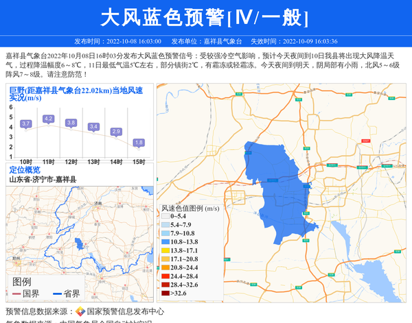 嘉祥县气象台2022年10月08日16时03分发布大风蓝色预警信号:受较强冷空气影响,预计今天夜间到10日我县将出现大风降温天气,过程降温幅度6~8℃,11日最低气温5℃左右,部分镇街2℃,有霜冻或轻霜冻。今天夜间到明天,阴局部有小雨,北风5~6级阵风7~8级。请注意防范! 信息来源:国家预警信息发布中心; 发布单位:嘉祥县气象台。