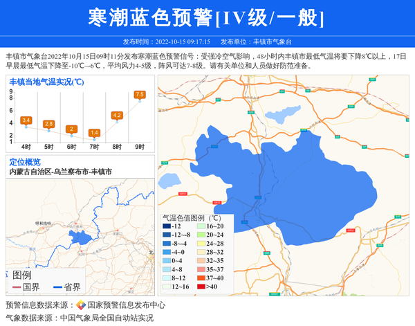 丰镇市气象台2022年10月15日09时11分发布寒潮蓝色预警信号:受强冷空气影响,48小时内丰镇市最低气温将要下降8℃以上,17日早晨最低气温下降至-10℃~-6℃,平均风力4-5级,阵风可达7-8级。请有关单位和人员做好防范准备。 信息来源:国家预警信息发布中心; 发布单位:丰镇市气象台。