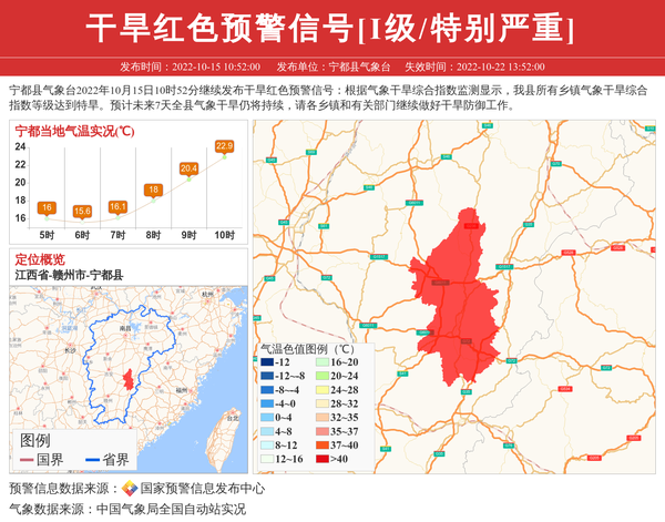 宁都县气象台2022年10月15日10时52分继续发布干旱红色预警信号:根据气象干旱综合指数监测显示,我县所有乡镇气象干旱综合指数等级达到特旱。预计未来7天全县气象干旱仍将持续,请各乡镇和有关部门继续做好干旱防御工作。 信息来源:国家预警信息发布中心; 发布单位:宁都县气象台。