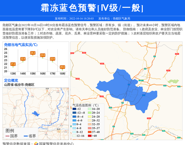 尧都区气象台2022年10月16日18时20分发布霜冻蓝色预警信号,预警区域:所有乡、镇(街道)。预计未来48小时,预警区域内地面最低温度将要下降到0℃以下,对农业将产生影响。请有关单位和人员做好防范准备。 防御指南: 1.政府及农业、林业部门按照职责做好防霜冻准备工作; 2.对农作物、蔬菜、花卉、瓜果、林业育种要采取一定的防护措施; 3.农村基层组织和农户要关注当地霜冻预警信息,以便采取措施加强防护。 信息来源:国家预警信息发布中心; 发布单位:尧都区气象局。