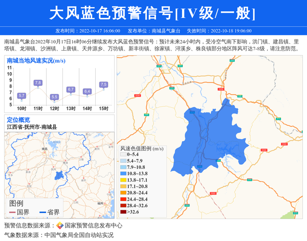 南城县气象台2022年10月17日16时06分继续发布大风蓝色预警信号:预计未来24小时内,受冷空气南下影响,洪门镇、建昌镇、里塔镇、龙湖镇、沙洲镇、上唐镇、天井源乡、万坊镇、新丰街镇、徐家镇、浔溪乡、株良镇部分地区阵风可达7-8级,请注意防范。 信息来源:国家预警信息发布中心; 发布单位:南城县气象台。