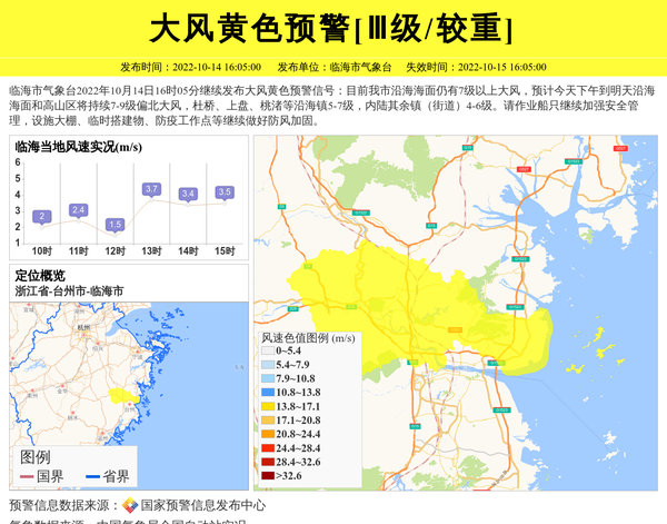 临海市气象台2022年10月14日16时05分继续发布大风黄色预警信号:目前我市沿海海面仍有7级以上大风,预计今天下午到明天沿海海面和高山区将持续7-9级偏北大风,杜桥、上盘、桃渚等沿海镇5-7级,内陆其余镇(街道)4-6级。请作业船只继续加强安全管理,设施大棚、临时搭建物、防疫工作点等继续做好防风加固。 信息来源:国家预警信息发布中心; 发布单位:临海市气象台。