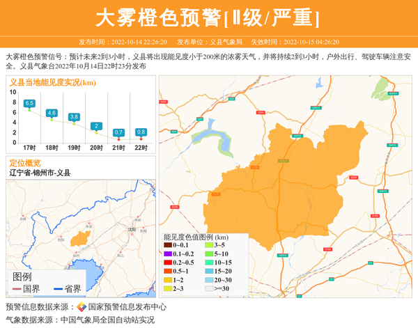 大雾橙色预警信号:预计未来2到3小时,义县将出现能见度小于200米的浓雾天气,并将持续2到3小时,户外出行、驾驶车辆注意安全。义县气象台2022年10月14日22时23分发布 信息来源:国家预警信息发布中心; 发布单位:义县气象局。