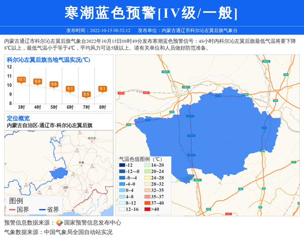 内蒙古通辽市科尔沁左翼后旗气象台2022年10月15日08时49分发布寒潮蓝色预警信号:48小时内科尔沁左翼后旗最低气温将要下降8℃以上,最低气温小于等于4℃,平均风力可达5级以上。请有关单位和人员做好防范准备。 信息来源:国家预警信息发布中心; 发布单位:内蒙古通辽市科尔沁左翼后旗气象台。