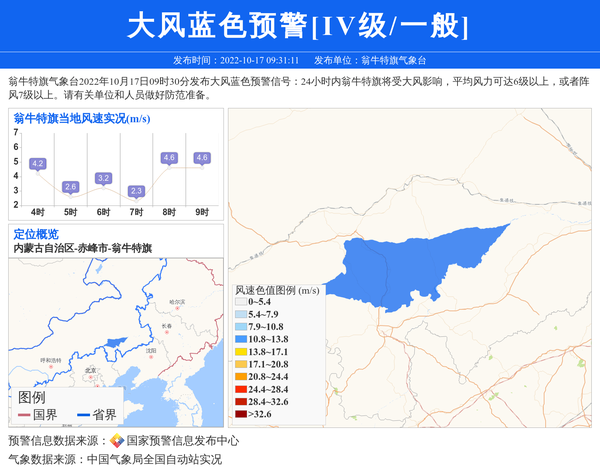 翁牛特旗气象台2022年10月17日09时30分发布大风蓝色预警信号:24小时内翁牛特旗将受大风影响,平均风力可达6级以上,或者阵风7级以上。请有关单位和人员做好防范准备。 信息来源:国家预警信息发布中心; 发布单位:翁牛特旗气象台。
