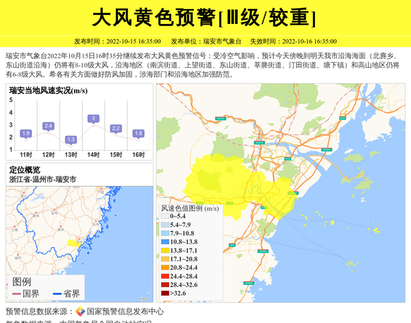 瑞安市气象台2022年10月15日16时35分继续发布大风黄色预警信号:受冷空气影响,预计今天傍晚到明天我市沿海海面(北麂乡、东山街道沿海)仍将有8-10级大风,沿海地区(南滨街道、上望街道、东山街道、莘塍街道、汀田街道、塘下镇)和高山地区仍将有6-8级大风。希各有关方面做好防风加固,涉海部门和沿海地区加强防范。 信息来源:国家预警信息发布中心; 发布单位:瑞安市气象台。