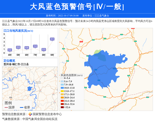 江口县气象台2022年10月17日09时38分发布大风蓝色预警信号:预计未来24小时内我县梵净山区域将受到大风影响,平均风力可达6级以上,阵风7级以上,请注意防范大风带来的不利影响。 信息来源:国家预警信息发布中心; 发布单位:江口县气象台。