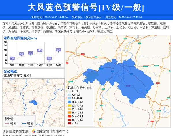 泰和县气象台2022年10月17日14时51分发布大风蓝色预警信号:预计未来24小时内,受干冷空气和台风共同影响,澄江镇、冠朝镇、灌溪镇、禾市镇、老营盘镇、螺溪镇、马市镇、南溪乡、桥头镇、沙村镇、上模乡、上圯乡、石山乡、水槎乡、苏溪镇、塘洲镇、万合镇、小龙镇、沿溪镇、苑前镇、中龙乡的部分地方阵风可达7级,请注意防范。 信息来源:国家预警信息发布中心; 发布单位:泰和县气象台。