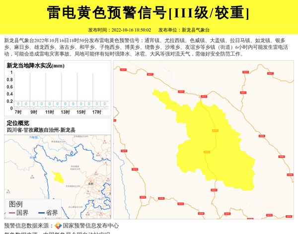 新龙县气象台2022年10月16日18时50分发布雷电黄色预警信号:通宵镇、尤拉西镇、色威镇、大盖镇、拉日马镇、如龙镇、银多乡、麻日乡、雄龙西乡、洛古乡、和平乡、子拖西乡、博美乡、绕鲁乡、沙堆乡、友谊乡等乡镇(街道)6小时内可能发生雷电活动,可能会造成雷电灾害事故。局地可能伴有短时强降水、冰雹、大风等强对流天气,需做好安全防范工作。 信息来源:国家预警信息发布中心; 发布单位:新龙县气象台。