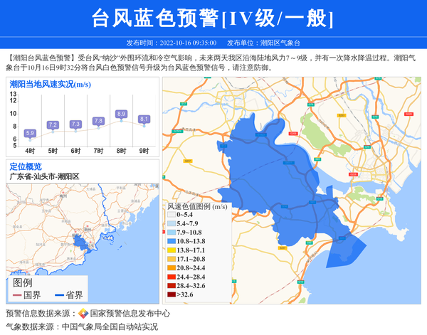 【潮阳台风蓝色预警】受台风“纳沙”外围环流和冷空气影响,未来两天我区沿海陆地风力7~9级,并有一次降水降温过程。潮阳气象台于10月16日9时32分将台风白色预警信号升级为台风蓝色预警信号,请注意防御。 信息来源:国家预警信息发布中心; 发布单位:潮阳区气象台。