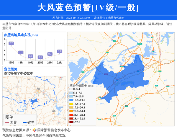 赤壁市气象台2022年10月16日22时35分发布大风蓝色预警信号:预计今天夜间到明天,我市将有4到5级偏北风,阵风6到8级,请注意防范。 信息来源:国家预警信息发布中心; 发布单位:赤壁市气象台。
