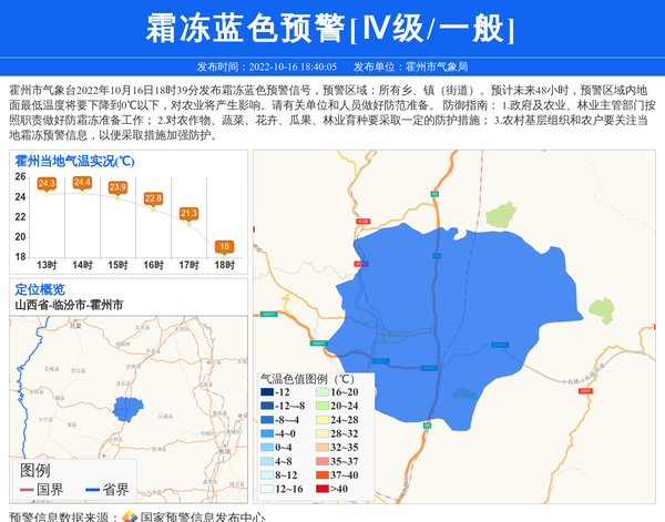 霍州市气象台2022年10月16日18时39分发布霜冻蓝色预警信号,预警区域:所有乡、镇(街道)。预计未来48小时,预警区域内地面最低温度将要下降到0℃以下,对农业将产生影响。请有关单位和人员做好防范准备。 防御指南: 1.政府及农业、林业主管部门按照职责做好防霜冻准备工作; 2.对农作物、蔬菜、花卉、瓜果、林业育种要采取一定的防护措施; 3.农村基层组织和农户要关注当地霜冻预警信息,以便采取措施加强防护。 信息来源:国家预警信息发布中心; 发布单位:霍州市气象局。