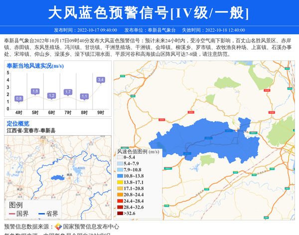奉新县气象台2022年10月17日09时40分发布大风蓝色预警信号:预计未来24小时内,受冷空气南下影响,百丈山名胜风景区、赤岸镇、赤田镇、东风垦殖场、冯川镇、甘坊镇、干洲垦殖场、干洲镇、会埠镇、柳溪乡、罗市镇、农牧渔良种场、上富镇、石溪办事处、宋埠镇、仰山乡、澡溪乡、澡下镇江湖水面、平原河谷和高海拔山区阵风可达7-8级,请注意防范。 信息来源:国家预警信息发布中心; 发布单位:奉新县气象台。