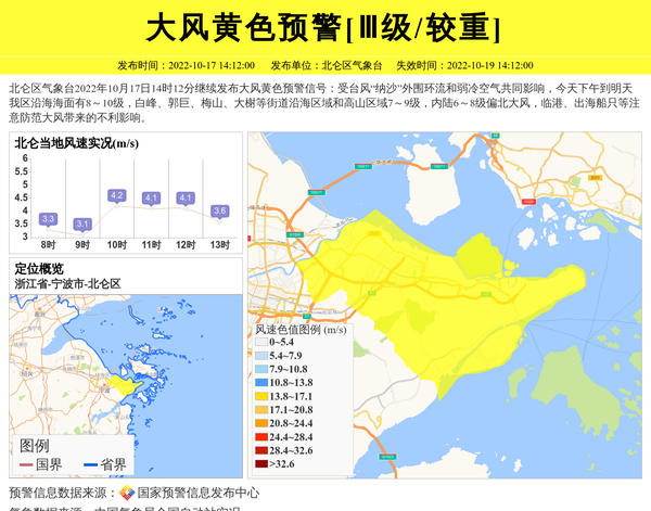 北仑区气象台2022年10月17日14时12分继续发布大风黄色预警信号:受台风“纳沙”外围环流和弱冷空气共同影响,今天下午到明天我区沿海海面有8~10级,白峰、郭巨、梅山、大榭等街道沿海区域和高山区域7~9级,内陆6~8级偏北大风,临港、出海船只等注意防范大风带来的不利影响。 信息来源:国家预警信息发布中心; 发布单位:北仑区气象台。