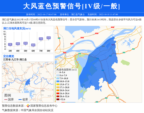 湖口县气象台2022年10月17日08时47分发布大风蓝色预警信号:受冷空气影响,预计未来24小时内,我县部分乡镇平均风力可达6级以上,江湖水面阵风可达7-8级,请注意防范。 信息来源:国家预警信息发布中心; 发布单位:湖口县气象台。