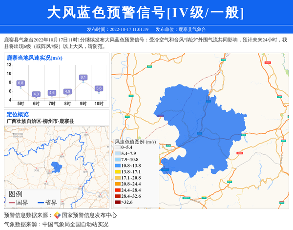鹿寨县气象台2022年10月17日11时1分继续发布大风蓝色预警信号:受冷空气和台风“纳沙”外围气流共同影响,预计未来24小时,我县将出现6级(或阵风7级)以上大风,请防范。 信息来源:国家预警信息发布中心; 发布单位:鹿寨县气象台。