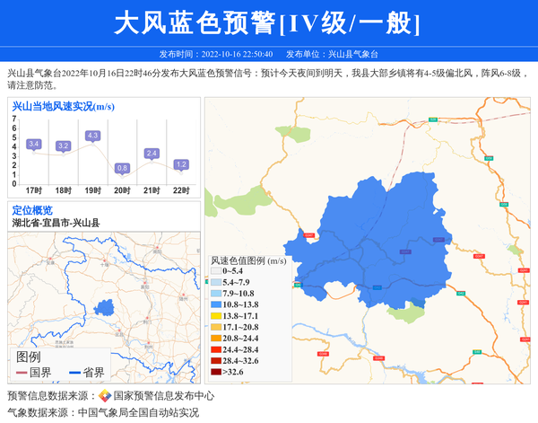 兴山县气象台2022年10月16日22时46分发布大风蓝色预警信号:预计今天夜间到明天,我县大部乡镇将有4-5级偏北风,阵风6-8级,请注意防范。 信息来源:国家预警信息发布中心; 发布单位:兴山县气象台。