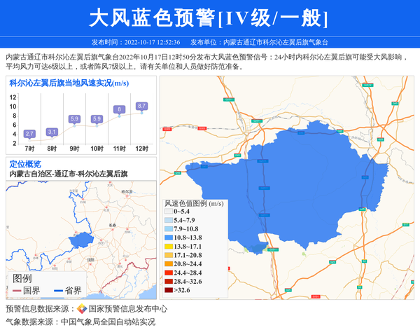 内蒙古通辽市科尔沁左翼后旗气象台2022年10月17日12时50分发布大风蓝色预警信号:24小时内科尔沁左翼后旗可能受大风影响,平均风力可达6级以上,或者阵风7级以上。请有关单位和人员做好防范准备。 信息来源:国家预警信息发布中心; 发布单位:内蒙古通辽市科尔沁左翼后旗气象台。