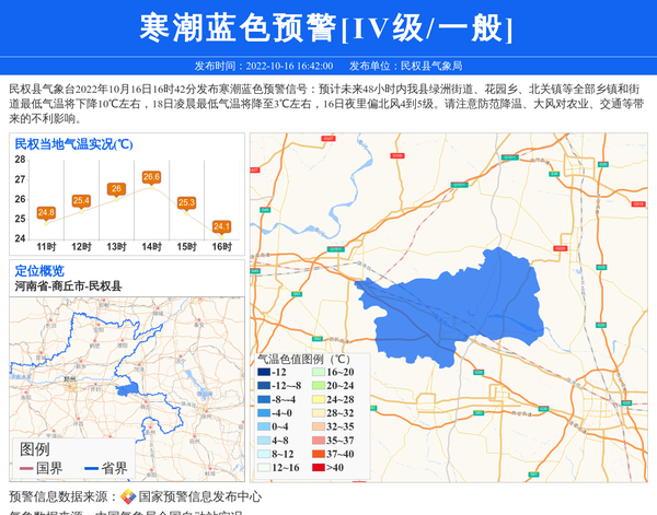 民权县气象台2022年10月16日16时42分发布寒潮蓝色预警信号:预计未来48小时内我县绿洲街道、花园乡、北关镇等全部乡镇和街道最低气温将下降10℃左右,18日凌晨最低气温将降至3℃左右,16日夜里偏北风4到5级。请注意防范降温、大风对农业、交通等带来的不利影响。 信息来源:国家预警信息发布中心; 发布单位:民权县气象局。