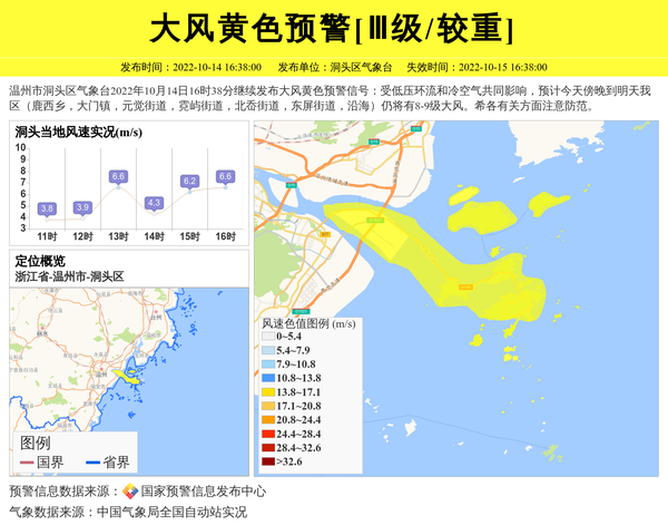 温州市洞头区气象台2022年10月14日16时38分继续发布大风黄色预警信号:受低压环流和冷空气共同影响,预计今天傍晚到明天我区(鹿西乡,大门镇,元觉街道,霓屿街道,北岙街道,东屏街道,沿海)仍将有8-9级大风。希各有关方面注意防范。 信息来源:国家预警信息发布中心; 发布单位:洞头区气象台。