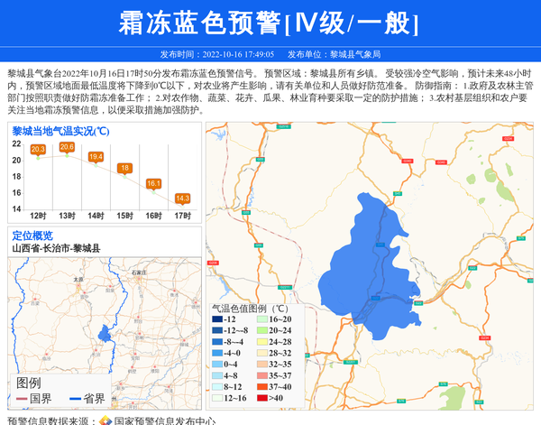黎城县气象台2022年10月16日17时50分发布霜冻蓝色预警信号。 预警区域:黎城县所有乡镇。 受较强冷空气影响,预计未来48小时内,预警区域地面最低温度将下降到0℃以下,对农业将产生影响,请有关单位和人员做好防范准备。 防御指南: 1.政府及农林主管部门按照职责做好防霜冻准备工作; 2.对农作物、蔬菜、花卉、瓜果、林业育种要采取一定的防护措施; 3.农村基层组织和农户要关注当地霜冻预警信息,以便采取措施加强防护。 信息来源:国家预警信息发布中心; 发布单位:黎城县气象局。