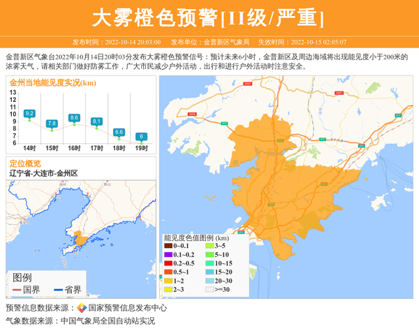 金普新区气象台2022年10月14日20时03分发布大雾橙色预警信号:预计未来6小时,金普新区及周边海域将出现能见度小于200米的浓雾天气,请相关部门做好防雾工作,广大市民减少户外活动,出行和进行户外活动时注意安全。 信息来源:国家预警信息发布中心; 发布单位:金普新区气象局。