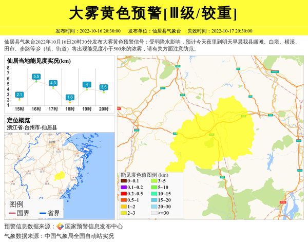 仙居县气象台2022年10月16日20时30分发布大雾黄色预警信号:受弱降水影响,预计今天夜里到明天早晨我县皤滩、白塔、横溪、田市、步路等乡(镇、街道)将出现能见度小于500米的浓雾,请有关方面注意防范。 信息来源:国家预警信息发布中心; 发布单位:仙居县气象台。