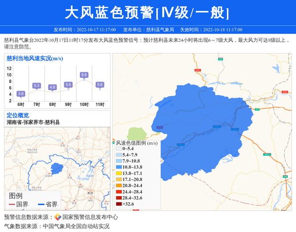 慈利县气象台2022年10月17日11时17分发布大风蓝色预警信号:预计慈利县未来24小时将出现6~7级大风,最大风力可达8级以上,请注意防范。 信息来源:国家预警信息发布中心; 发布单位:慈利县气象局。