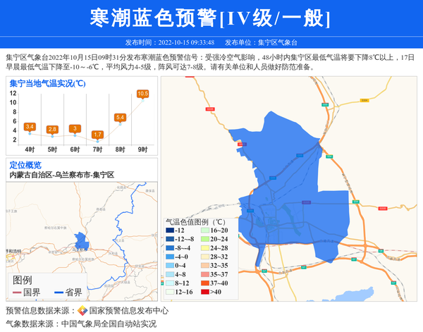 集宁区气象台2022年10月15日09时31分发布寒潮蓝色预警信号:受强冷空气影响,48小时内集宁区最低气温将要下降8℃以上,17日早晨最低气温下降至-10~-6℃,平均风力4-5级,阵风可达7-8级。请有关单位和人员做好防范准备。 信息来源:国家预警信息发布中心; 发布单位:集宁区气象台。