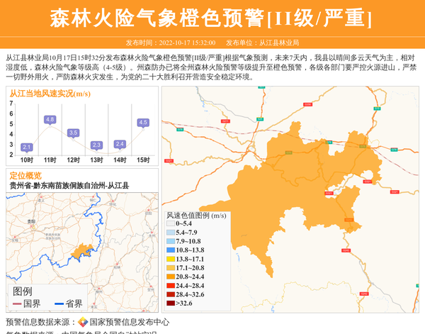 从江县林业局10月17日15时32分发布森林火险气象橙色预警[II级/严重]根据气象预测,未来7天内,我县以晴间多云天气为主,相对湿度低,森林火险气象等级高(4-5级)。州森防办已将全州森林火险预警等级提升至橙色预警,各级各部门要严控火源进山,严禁一切野外用火,严防森林火灾发生,为党的二十大胜利召开营造安全稳定环境。 信息来源:国家预警信息发布中心; 发布单位:从江县林业局。
