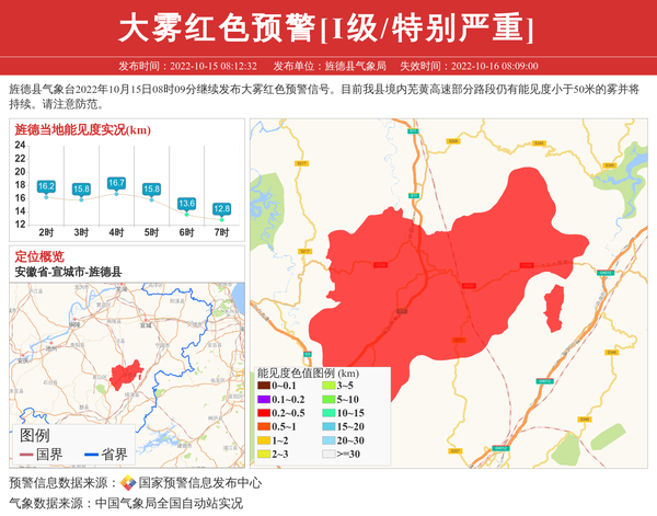 旌德县气象台2022年10月15日08时09分继续发布大雾红色预警信号。目前我县境内芜黄高速部分路段仍有能见度小于50米的雾并将持续。请注意防范。 信息来源:国家预警信息发布中心; 发布单位:旌德县气象局。