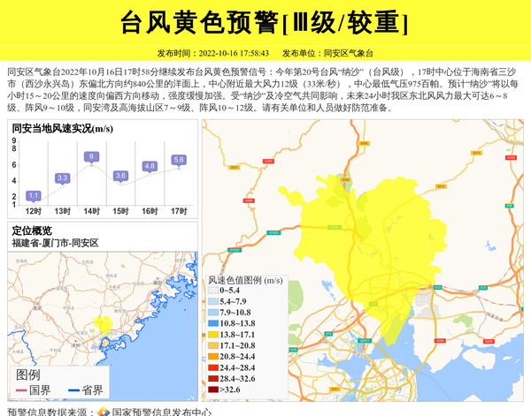 同安区气象台2022年10月16日17时58分继续发布台风黄色预警信号:今年第20号台风“纳沙”(台风级),17时中心位于海南省三沙市(西沙永兴岛)东偏北方向约840公里的洋面上,中心附近最大风力12级(33米/秒),中心最低气压975百帕。预计“纳沙”将以每小时15~20公里的速度向偏西方向移动,强度缓慢加强。受“纳沙”及冷空气共同影响,未来24小时我区东北风风力最大可达6~8级、阵风9~10级,同安湾及高海拔山区7~9级、阵风10~12级。请有关单位和人员做好防范准备。 信息来源:国家预警信息发布中心; 发布单位:同安区气象台。