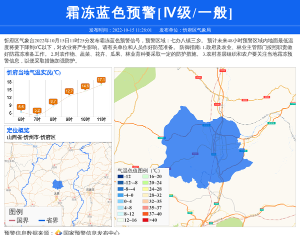 忻府区气象台2022年10月15日11时25分发布霜冻蓝色预警信号,预警区域:七办八镇三乡。 预计未来48小时预警区域内地面最低温度将要下降到0℃以下,对农业将产生影响。请有关单位和人员作好防范准备。 防御指南: 1.政府及农业、林业主管部门按照职责做好防霜冻准备工作。 2.对农作物、蔬菜、花卉、瓜果、林业育种要采取一定的防护措施。 3.农村基层组织和农户要关注当地霜冻预警信息,以便采取措施加强防护。 信息来源:国家预警信息发布中心; 发布单位:忻府区气象局。