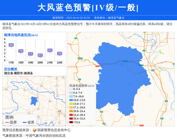 南漳县气象台2022年10月16日22时41分发布大风蓝色预警信号:预计今天夜间到明天,我县将有4到5级偏北风,阵风6到8级,请注意防范。 信息来源:国家预警信息发布中心; 发布单位:南漳县气象台。