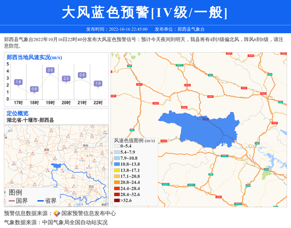 郧西县气象台2022年10月16日22时40分发布大风蓝色预警信号:预计今天夜间到明天,我县将有4到5级偏北风,阵风6到8级,请注意防范。 信息来源:国家预警信息发布中心; 发布单位:郧西县气象台。
