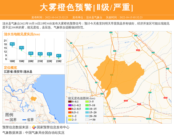 涟水县气象台2022年10月14日23时30分发布大雾橙色预警信号:预计今天夜里到明天早晨我县所有镇街,经济开发区可能出现能见度不足200米的雾,能见度低,县应急、气象联合提醒做好防范。 信息来源:国家预警信息发布中心; 发布单位:涟水县气象台。
