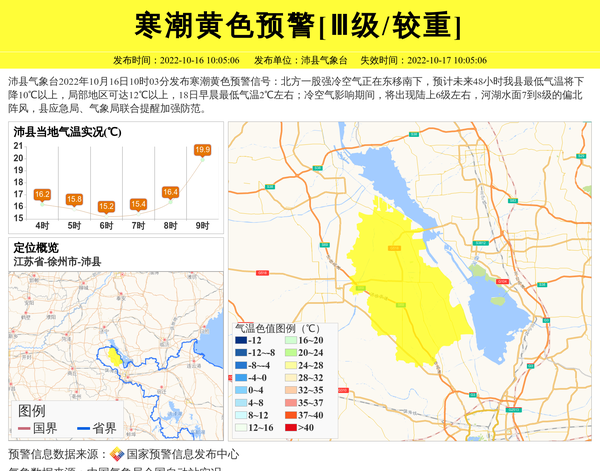 沛县气象台2022年10月16日10时03分发布寒潮黄色预警信号:北方一股强冷空气正在东移南下,预计未来48小时我县最低气温将下降10℃以上,局部地区可达12℃以上,18日早晨最低气温2℃左右;冷空气影响期间,将出现陆上6级左右,河湖水面7到8级的偏北阵风,县应急局、气象局联合提醒加强防范。 信息来源:国家预警信息发布中心; 发布单位:沛县气象台。