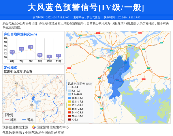 庐山气象台2022年10月17日11时15分继续发布大风蓝色预警信号:目前我山平均风力4-5级,阵风7-8级,预计大风仍将持续,请各有关单位注意防范。 信息来源:国家预警信息发布中心; 发布单位:庐山气象台。