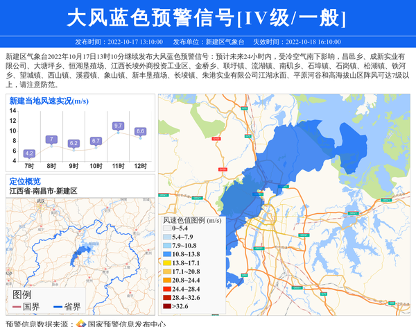 新建区气象台2022年10月17日13时10分继续发布大风蓝色预警信号:预计未来24小时内,受冷空气南下影响,昌邑乡、成新实业有限公司、大塘坪乡、恒湖垦殖场、江西长堎外商投资工业区、金桥乡、联圩镇、流湖镇、南矶乡、石埠镇、石岗镇、松湖镇、铁河乡、望城镇、西山镇、溪霞镇、象山镇、新丰垦殖场、长堎镇、朱港实业有限公司江湖水面、平原河谷和高海拔山区阵风可达7级以上,请注意防范。 信息来源:国家预警信息发布中心; 发布单位:新建区气象台。