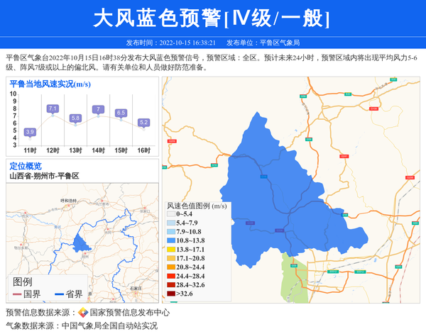 平鲁区气象台2022年10月15日16时38分发布大风蓝色预警信号,预警区域:全区。预计未来24小时,预警区域内将出现平均风力5-6级、阵风7级或以上的偏北风。请有关单位和人员做好防范准备。 信息来源:国家预警信息发布中心; 发布单位:平鲁区气象局。