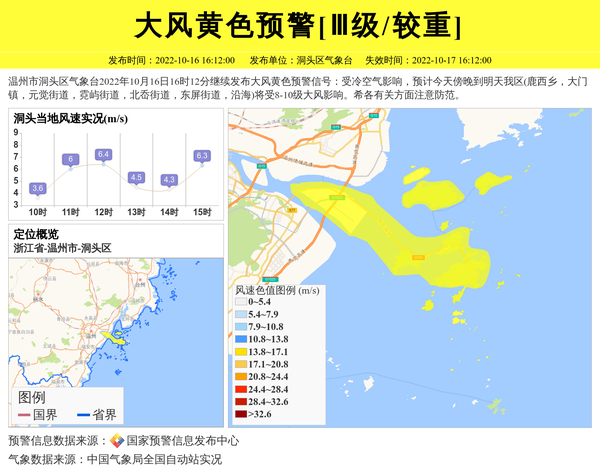 温州市洞头区气象台2022年10月16日16时12分继续发布大风黄色预警信号:受冷空气影响,预计今天傍晚到明天我区(鹿西乡,大门镇,元觉街道,霓屿街道,北岙街道,东屏街道,沿海)将受8-10级大风影响。希各有关方面注意防范。 信息来源:国家预警信息发布中心; 发布单位:洞头区气象台。