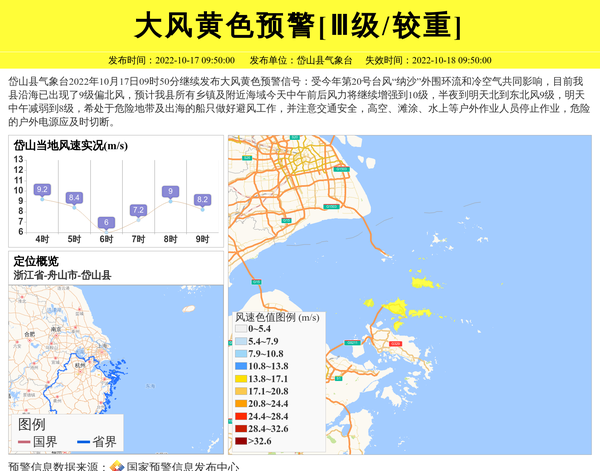 岱山县气象台2022年10月17日09时50分继续发布大风黄色预警信号:受今年第20号台风“纳沙”外围环流和冷空气共同影响,目前我县沿海已出现了9级偏北风,预计我县所有乡镇及附近海域今天中午前后风力将继续增强到10级,半夜到明天北到东北风9级,明天中午减弱到8级,希处于危险地带及出海的船只做好避风工作,并注意交通安全,高空、滩涂、水上等户外作业人员停止作业,危险的户外电源应及时切断。 信息来源:国家预警信息发布中心; 发布单位:岱山县气象台。